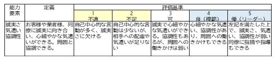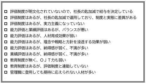 その会社の人事評価制度を確認すると、それらの要因となる能力を評価する項目が無いか、あっても客観的評価基準が無く、(良い、普通、悪い)など主観により評価がばらつき、課題が合意できていないという問題が見受けられます。